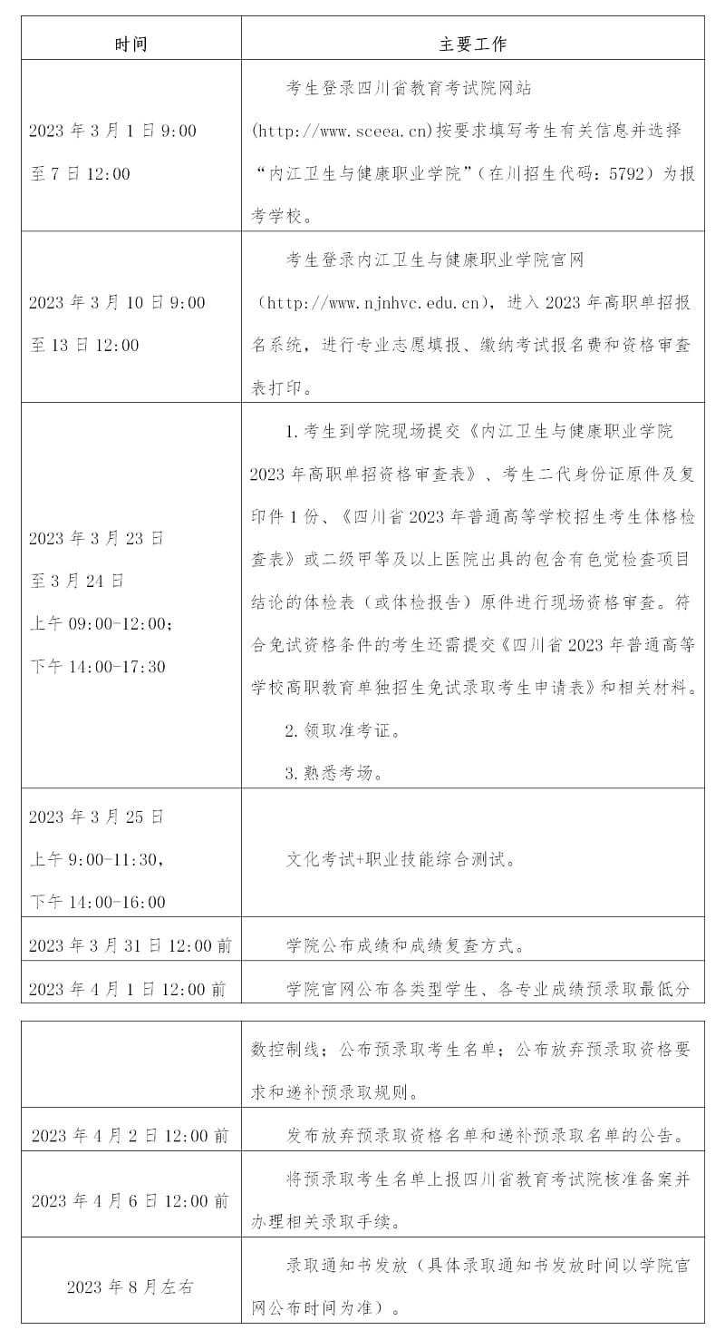 考生于2023年3月10日9:00至13日12:00,登录内江卫生与健康职业学院官网(http://www.njnhvc.edu.cn),进入2023年高职单招报名系统,按系统提示完成个人信息真实准确填写、专业志愿填报和缴纳考试报名费等环节。凡是未在规定时间范围内完成专业填报和缴费的考生视为自愿放弃学院2023年高职单招考试报名。考试报名费缴纳成功且报名成功以后,考试报名费不予退费。