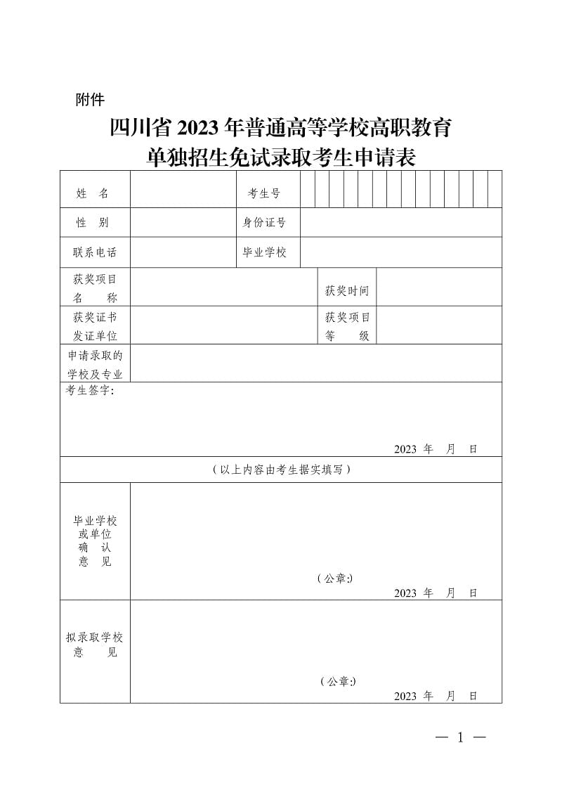 附件:四川省2023年普通高等学校高职教育单独招生免试录取考生申请表